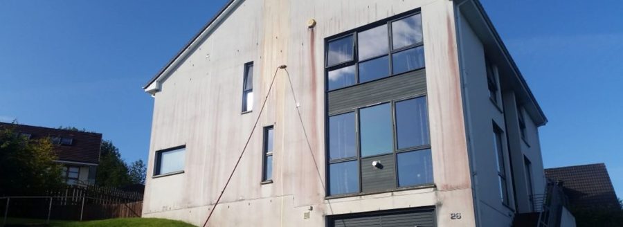 Most render we come across has red staining which is the most common. This is a form of algae and can be treated and removed with our softwashing service in Glasgow. Most people think they need to paint over this staining, but painting render can be a big mistake and cause costly problems further down the line. We can also remove other types of staining: Green algae/Black mould/soot/wood staining using the same process.